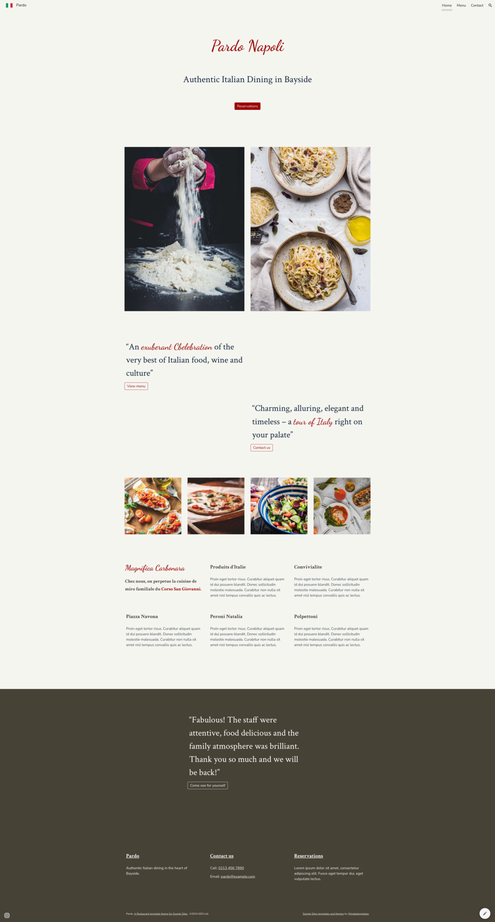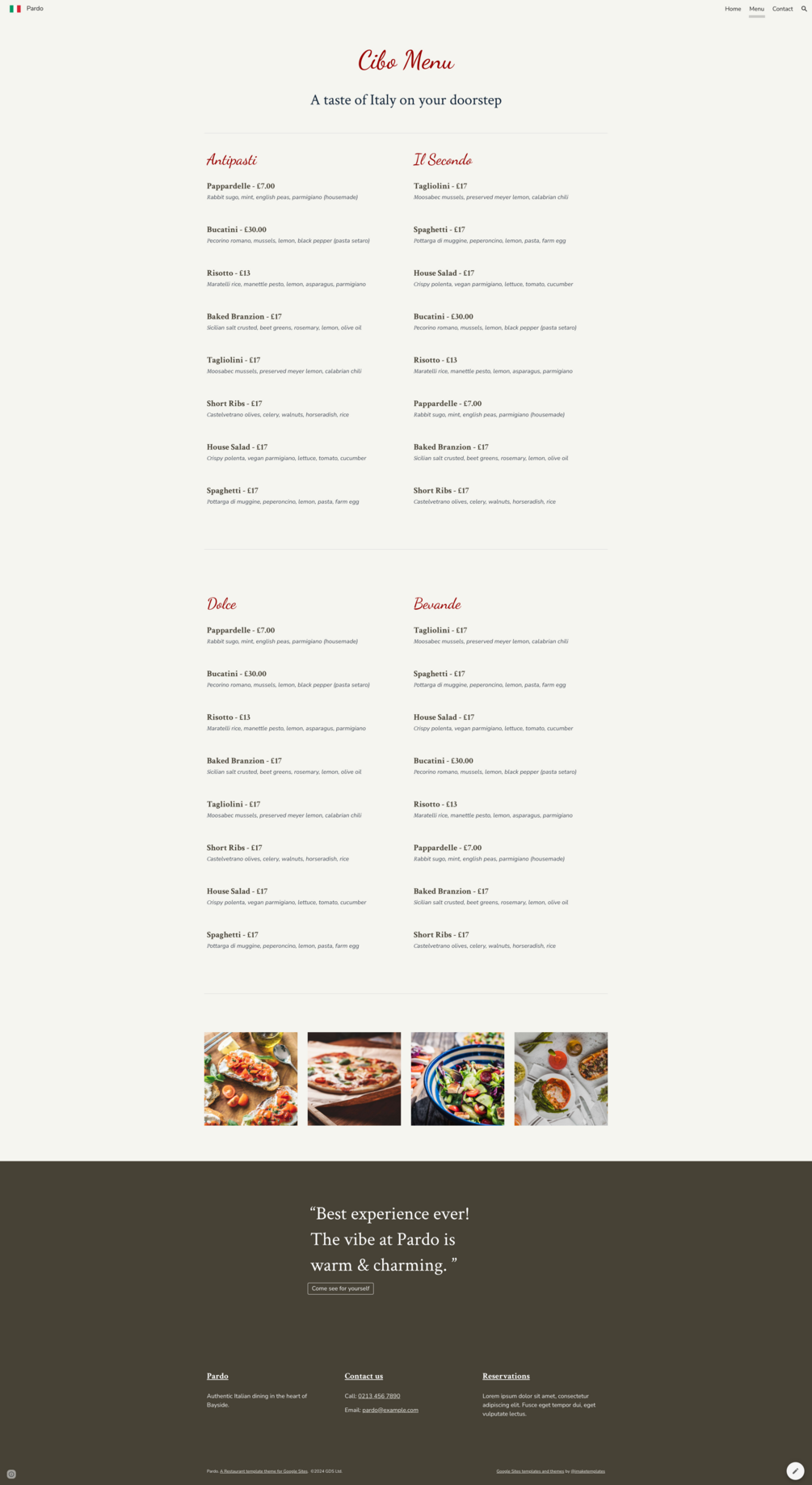 Pardo is a free restaurant template for Google Sites. It comes complete with all the features you need to showcase your menu, highlight your restaurant's unique atmosphere, and make it easy for customers to contact you to book a table or place an order. Styled for an Italian bistro or restaurant, it's versatile enough to fit any type of eatery using the simple Google Sites editor. Whether you serve casual diners or run a fine dining establishment, Pardo will work for you.