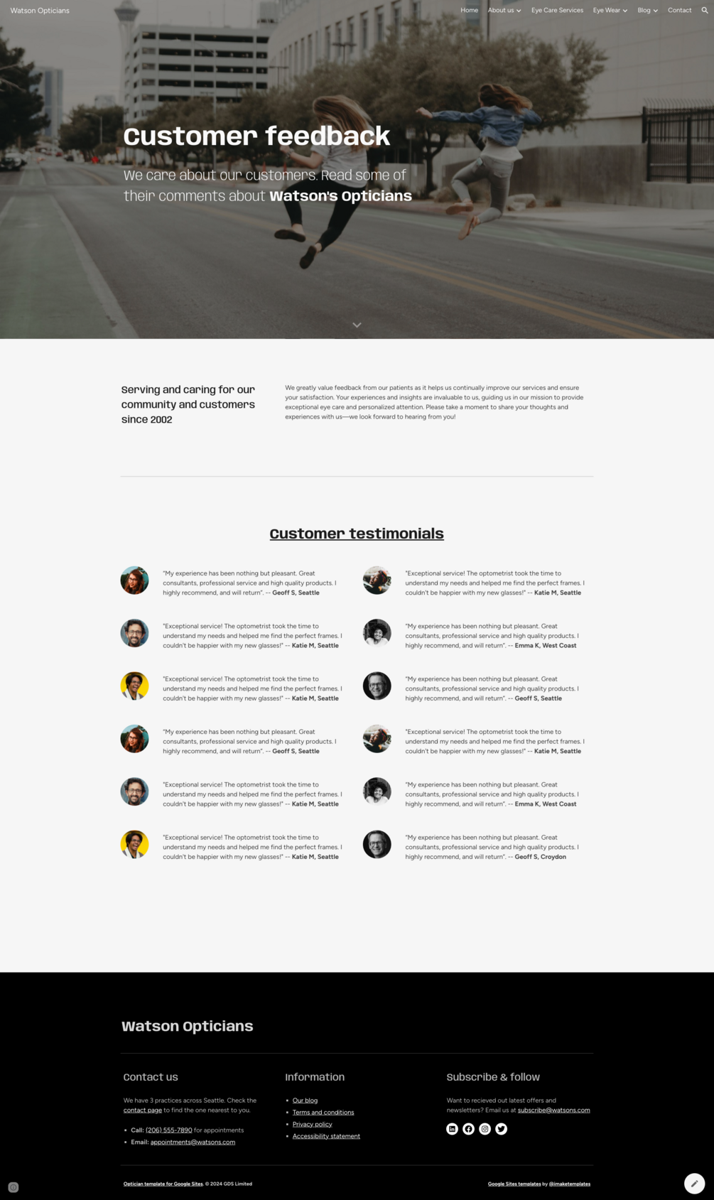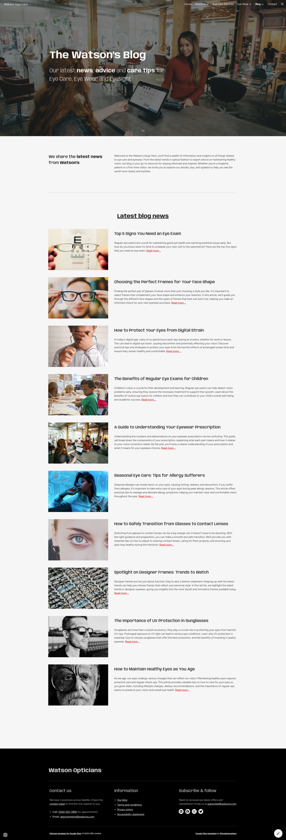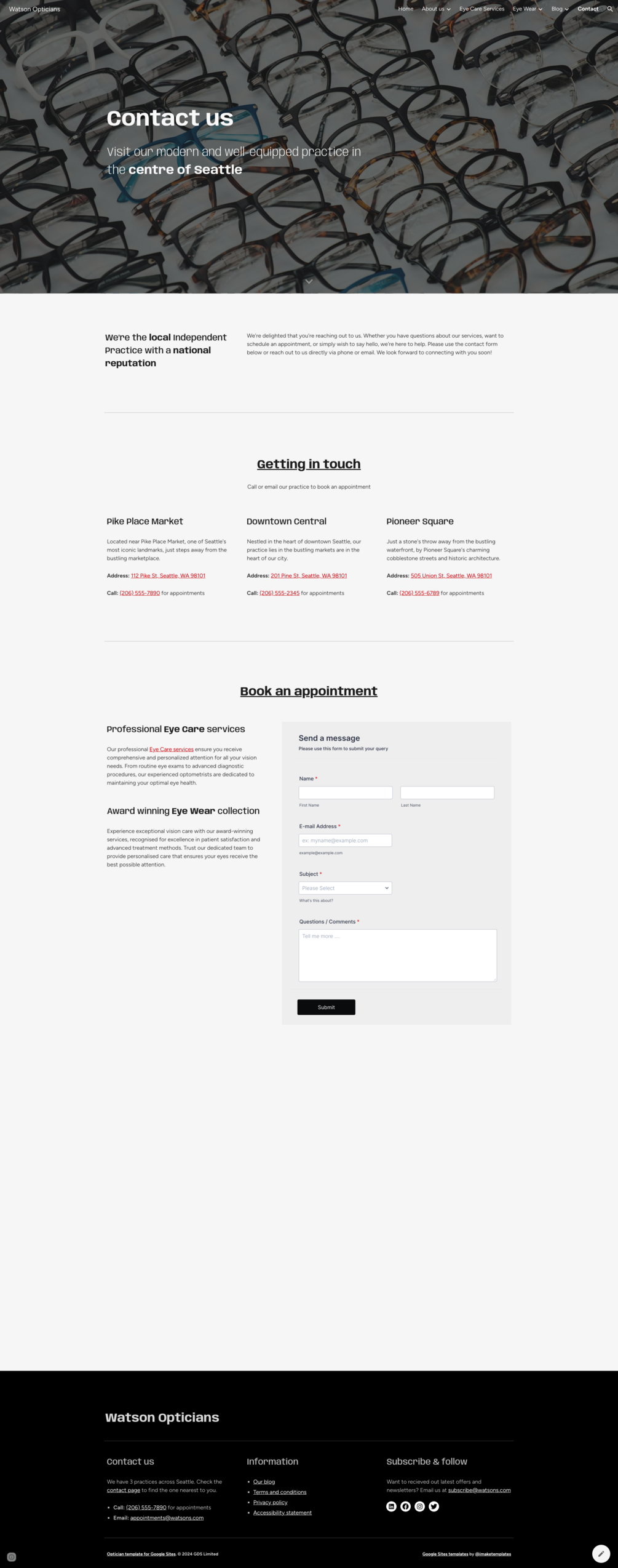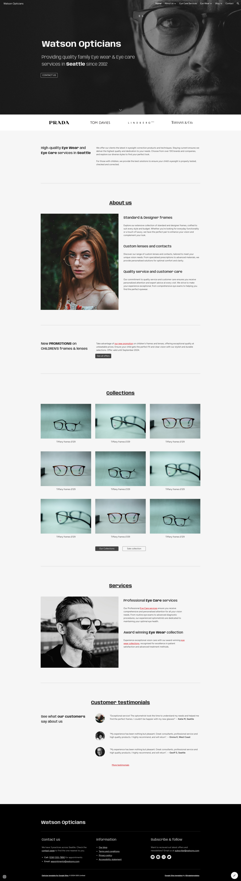 Watson Opticians / Optometrists Website Template for Google Sites + Appointments