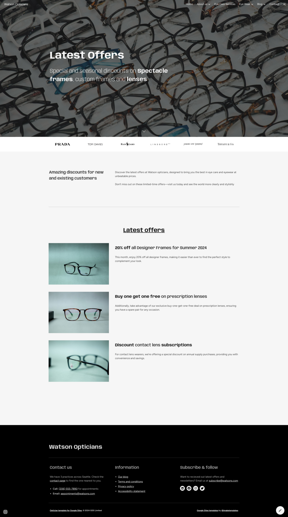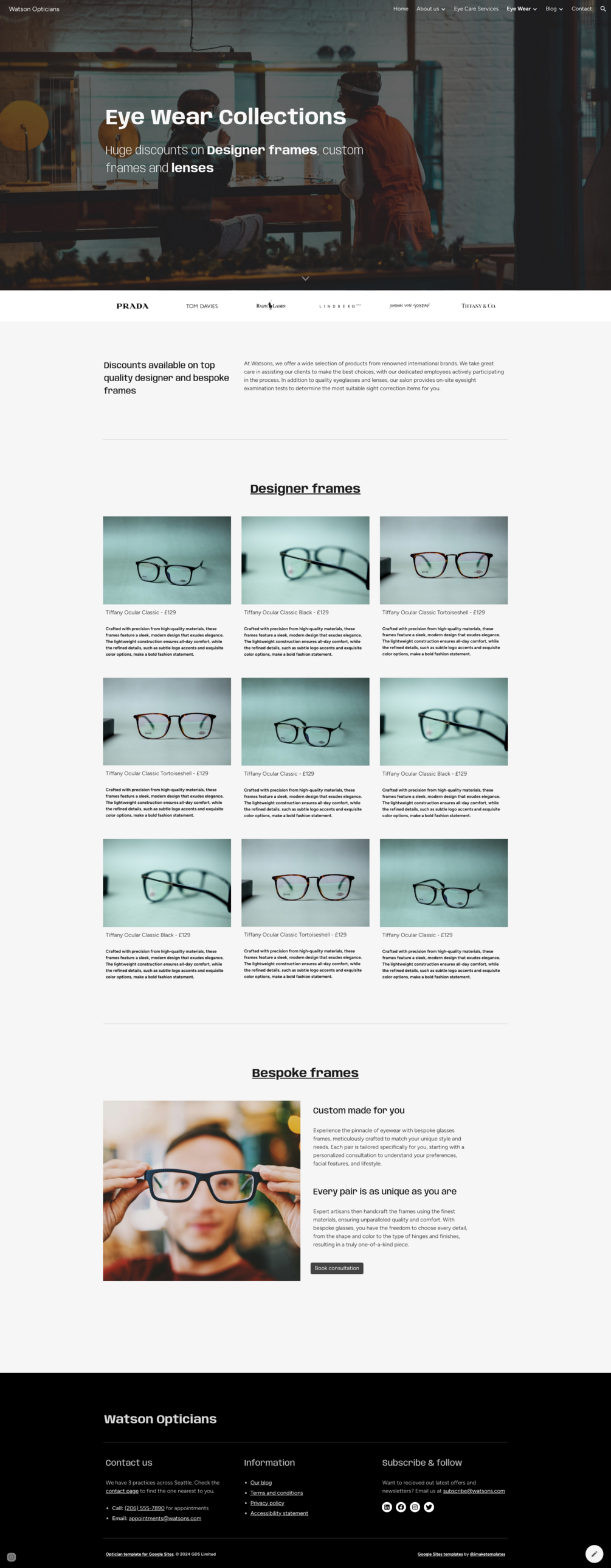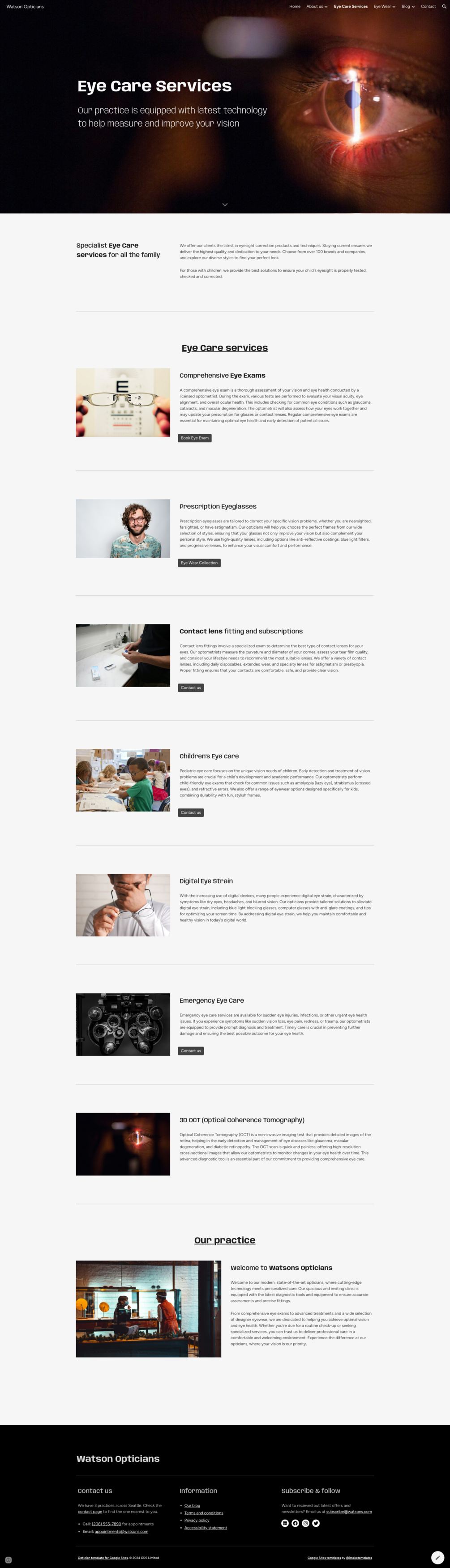 Watson Opticians / Optometrists Website Template for Google Sites + Appointments
