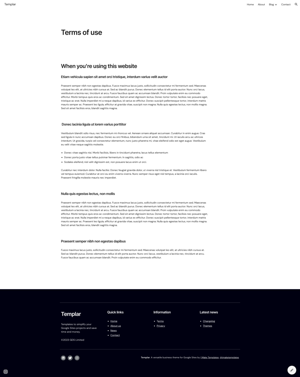 Templar is a Google Sites template ideal for any business website. Its minimal styling frames your content in a crisp, clear way to engage your user immediately. Simple yet sophisticated, Templar's bold typography and use of white space deliver a sense of quality and professionalism for any organisation.