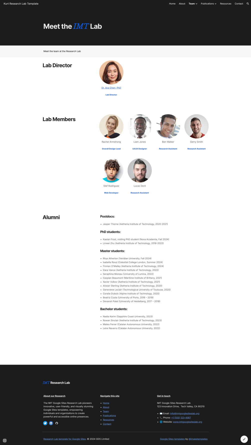 Introducing Kurt – the ultimate Google Sites template designed exclusively for research labs ready to showcase their innovative work. With a sleek, intuitive design that includes dedicated pages for Home, About, Resources, Publications (in both standard and simplified formats), Team, and Contact, Kurt makes it effortless to build a professional online presence.