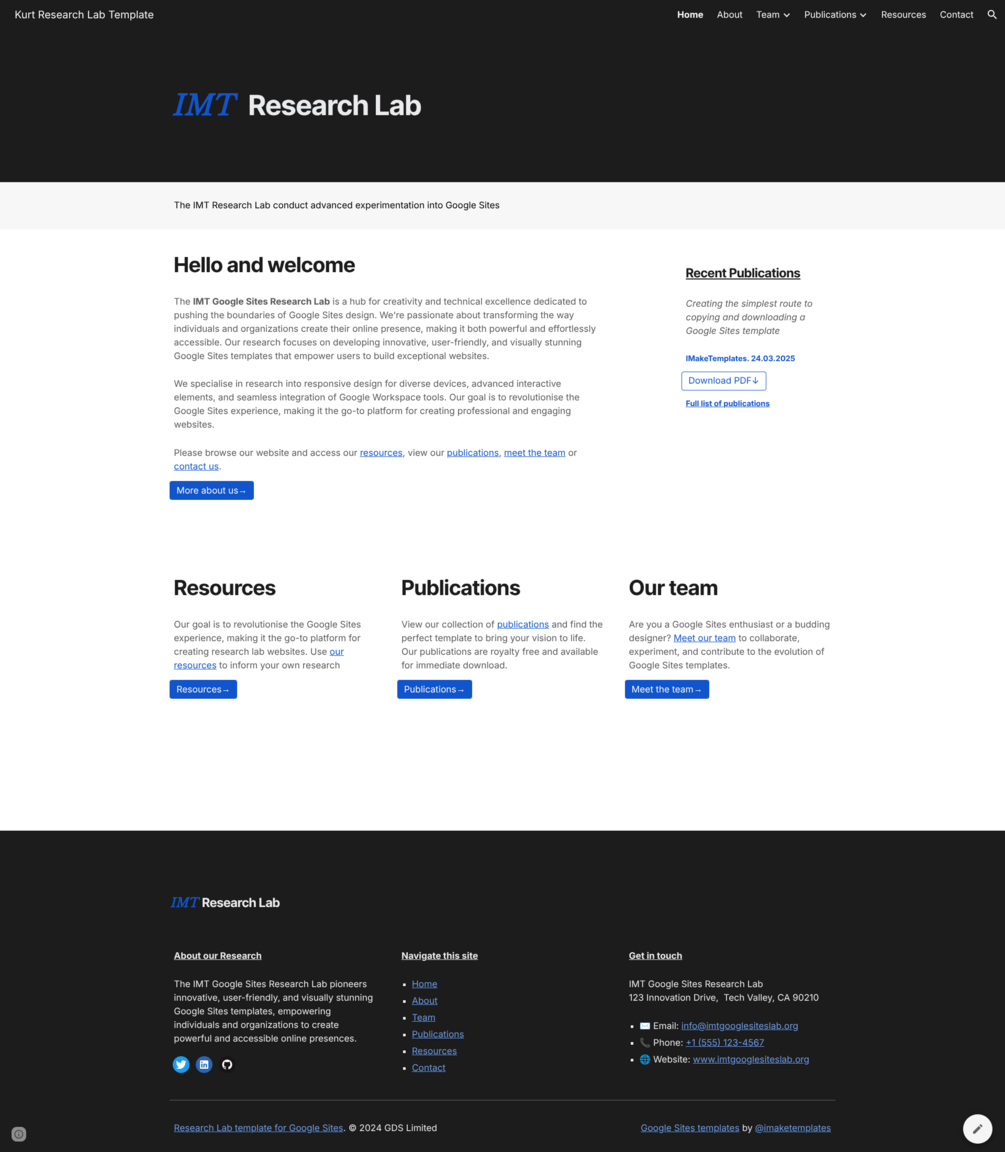 Introducing Kurt – the ultimate Google Sites template designed exclusively for research labs ready to showcase their innovative work. With a sleek, intuitive design that includes dedicated pages for Home, About, Resources, Publications (in both standard and simplified formats), Team, and Contact, Kurt makes it effortless to build a professional online presence.