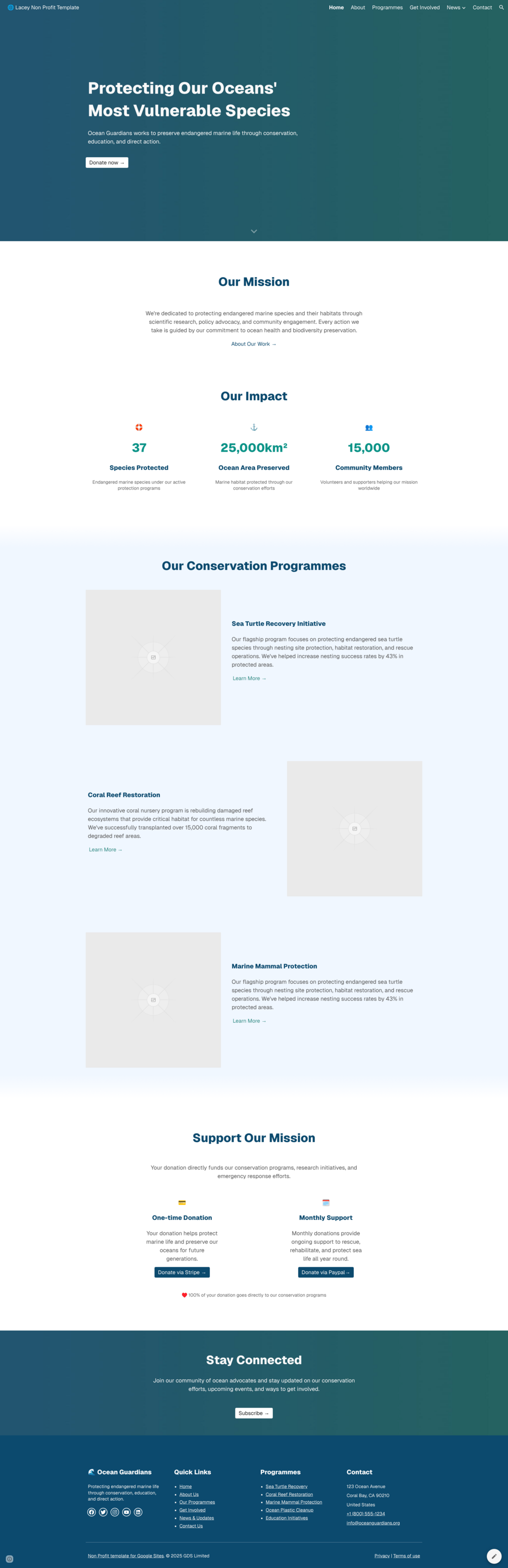 Lacey is a versatile Google Sites template designed for Non Profit organisations. Whether you're launching your first website or upgrading an existing one, Lacey is ideal to start a professional, polished, and functional website effortlessly.