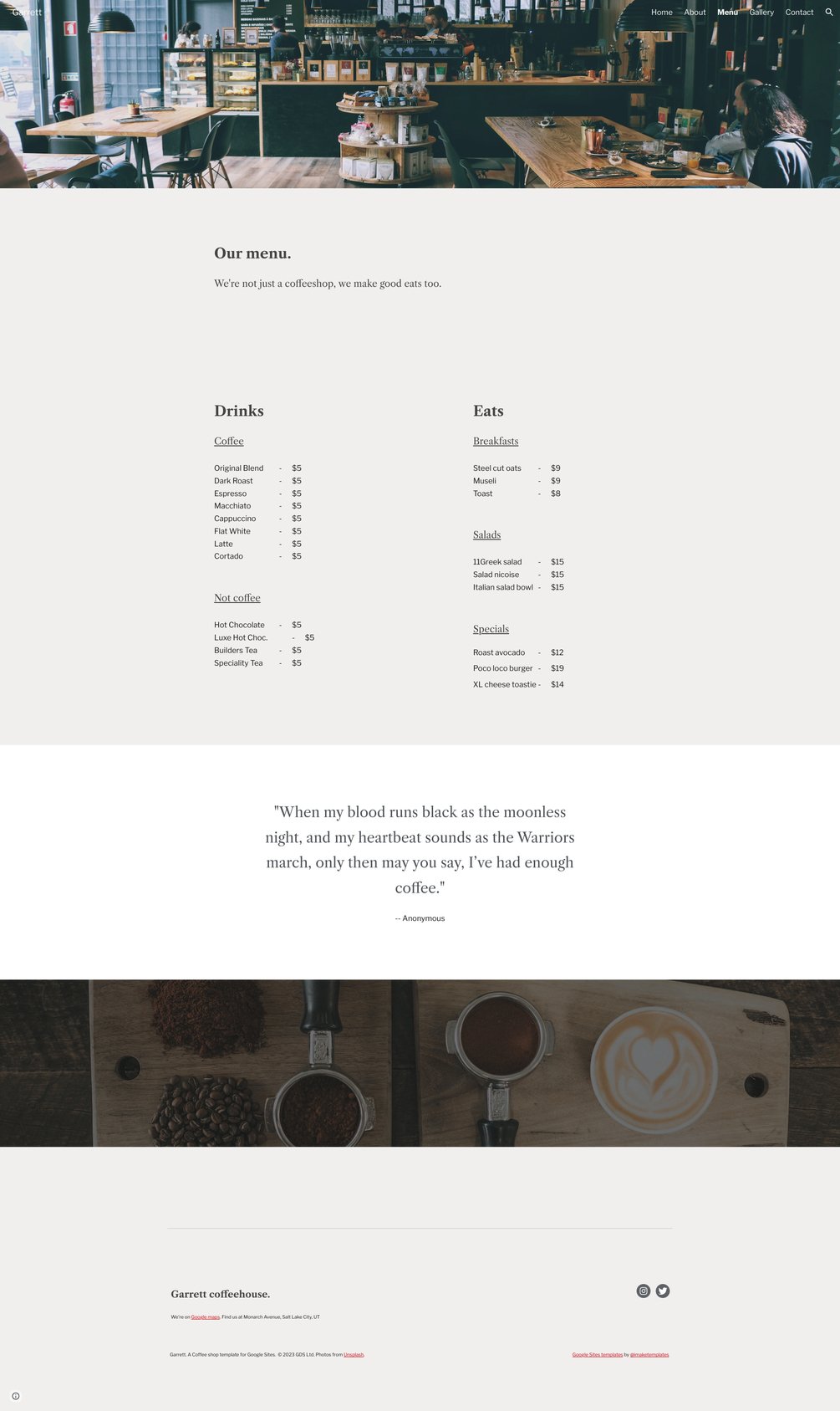 Run a coffee shop, bistro, bar or cafe? Then you need Garrett, a cafe inspired template for Google Sites.